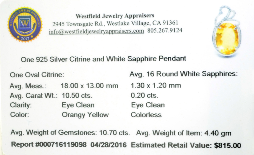10.70CT Citrine And White Sapphire Sterling Silver Pendant
