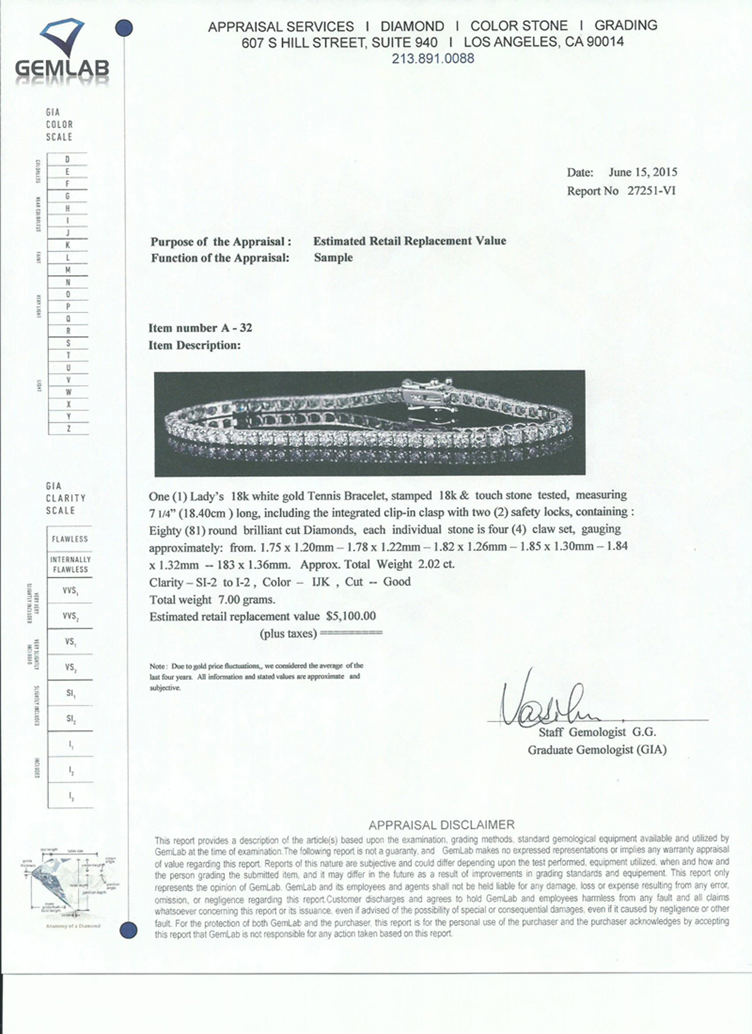 High Quality 2.02 Carat Diamond Tennis Bracelet in Gorgeous 18KT White Gold Setting! Brand New Custom Laid Hand Selected Diamonds! (VGN A-32)